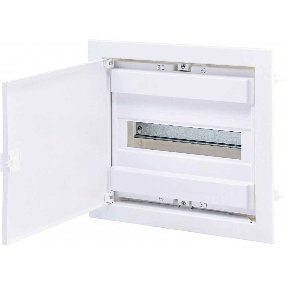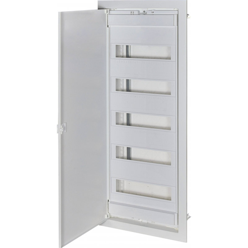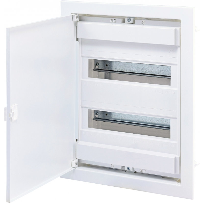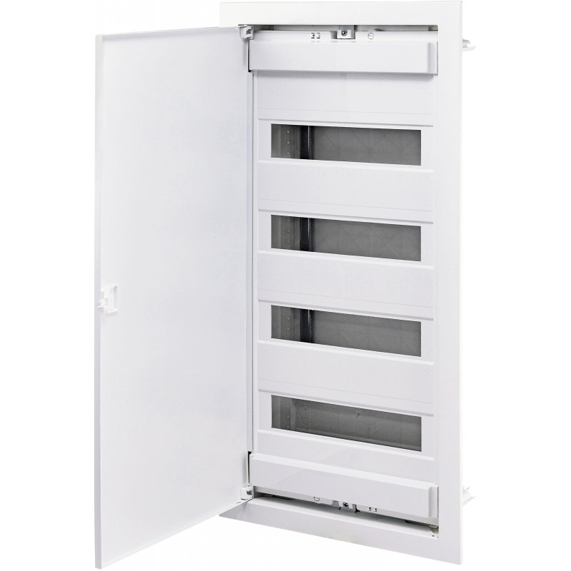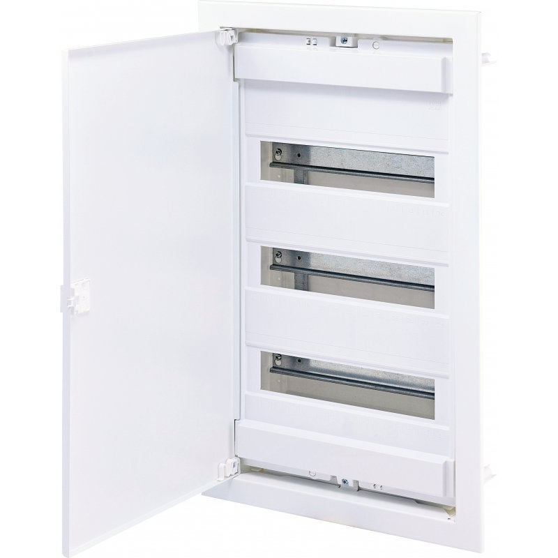 Розподільчий щит внутрішнього монтажу, розрахований на 36 модулів (з можливістю розширення до 42). Використовується для збирання електрощитів у житлових, офісних та комерційних приміщеннях. Має міцний металевий корпус, білу декоративну рамку та дверцята серії ECG для естетичного зовнішнього вигляду і зручного доступу до автоматичних вимикачів.