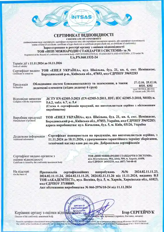 - Орієнтація на актуальні норми. ЕНЕЛ Україна працює в площині чинних стандартів( ДСТУ EN 62305-3:2021 — документ, що регламентує правила облаштування систем блискавкозахисту та заземлення).
