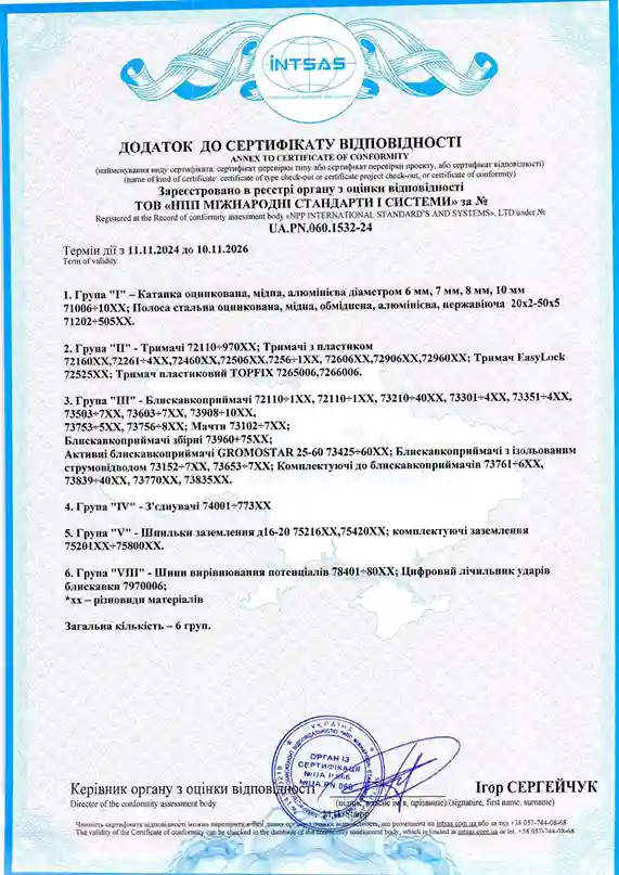 - Системність у підборі. Компанія розвиває лінійку так, щоб закривати весь «ланцюг» блискавкозахисту: перехоплення розряду, відведення струму, заземлення, контрольні вузли й аксесуари для довговічності (антикорозійні рішення, ревізійні елементи тощо).