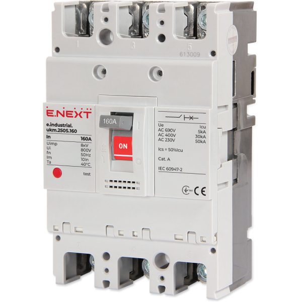 Силовий автоматичний вимикач e.industrial.ukm.250S.160, 3р, 160А призначений для захисту електричних ланцюгів від довгострокових перевантажень та струмів коротких замикань, а також для оперативного включення та відключення ділянок електричних мереж з частотою 50 Гц та напругою до 660 В.