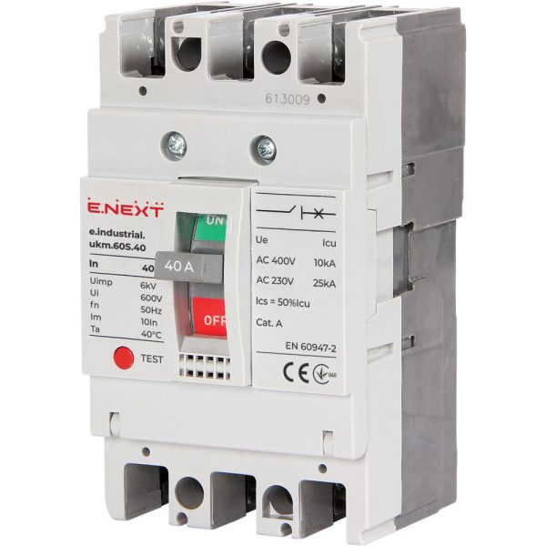Силовий автоматичний вимикач e.industrial.ukm.60S.40, 3р, 40А призначений для захисту електричних ланцюгів від довгострокових перевантажень та струмів коротких замикань, а також для оперативного включення та відключення ділянок електричних мереж з частотою 50 Гц та напругою до 660 В.