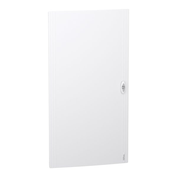 Суцільні двері для щитів PrismaSeT XS. Призначені для використання в щитах які містять 6 рядів по 24 модулі ( 18 мм ). Ступінь захисту IP40. Двері виготовлені зі сталі. Колір білий (RAL 9003). Двері можуть бути встановлені в навісний або врізний щит. Двері можна встановити та відкривати з правого або лівого боку щита. Необхідно визначити ID-номер ключа від замка. Загальні розміри: (Ш) 550 мм x (В) 1050 мм x (Г) 20 мм. Вага 7,630 кг. Ступінь ударозахисту IK09. Робоча температура від -25°C до 60°C.