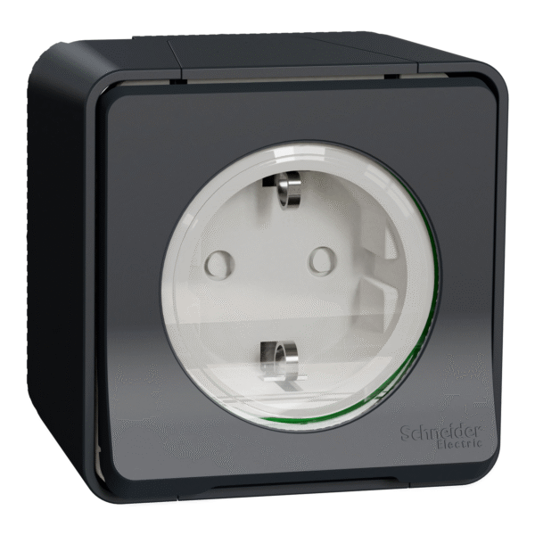 Розетка 1-а з заземлювальним контактом, зовнішня зі шторками IP55 “MUREVA S” чорна (C2)