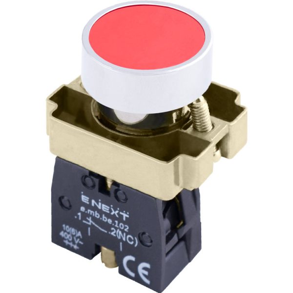 Кнопка без підсвітки плоска e.mb.ba42 червона, без фіксації, 1NС призначена для керування електричними ланцюгами змінного струму напругою до 400В частотою 50/60Гц та постійного струму до 220В, а також різним технологічним обладнанням