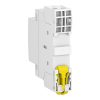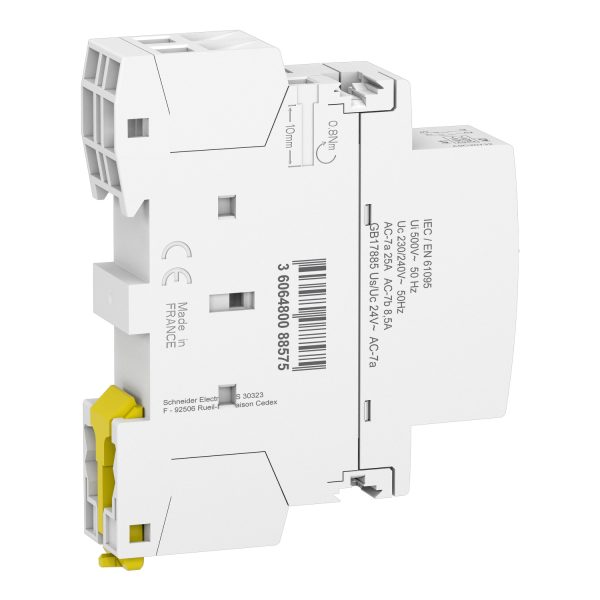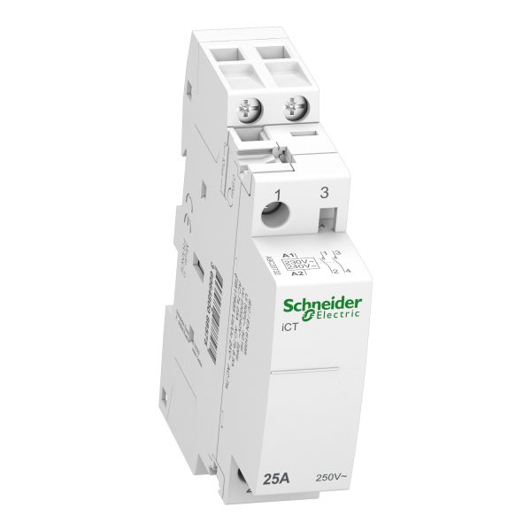 Acti9 iCT це модульний контактор. Це двохполюсний контактор з 2 нормально відкритими контактами. Номінальний струм становить 25 A для AC-7a та 8,5 A для AC-7b. Номінальна робоча напруга Ue становить 250 В змінного струму. Напруга керування Uc становить 230-240 В змінного струму. Контактор призначенний для організації електричних схем керування. Можливі застосування: дистанційне перемикання освітлювальних навантажень, невеликих двигунів (вентиляторів, змішувачів) або систем опалення, вентиляції та кондиціонування. Відповідає стандарту МЕК 61095. Електрична зносостійкість становить до 100 000 циклів для AC-7A або AC-1, 30 000 циклів для AC-7C, AC-7B, AC-3, AC-5A або AC-5B. Максимальна кількість операцій перемикання – 100 на день. Номінальна напруга ізоляції Ui становить 500 В змінного струму. Номінальна імпульсна витримувана напруга Uimp становить 4 кВ. Ступінь забруднення пристрою 2. Призначений для встановлення на DIN-рейку. Його ширина складає 2 модулі по 9 мм. Колір виробу білий (RAL9003). Розміри: (Ш) 81 мм x (В) 18 мм x (Г) 68,5 мм. Відповідно до стандарту МЕК 60529, ступінь захисту IP20 і IP40 при встановленні в щиті. Робоча температура від -5°C до 60°C. Температура зберігання від -40°С до 70°С.