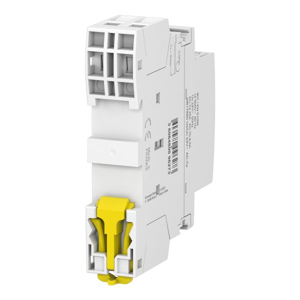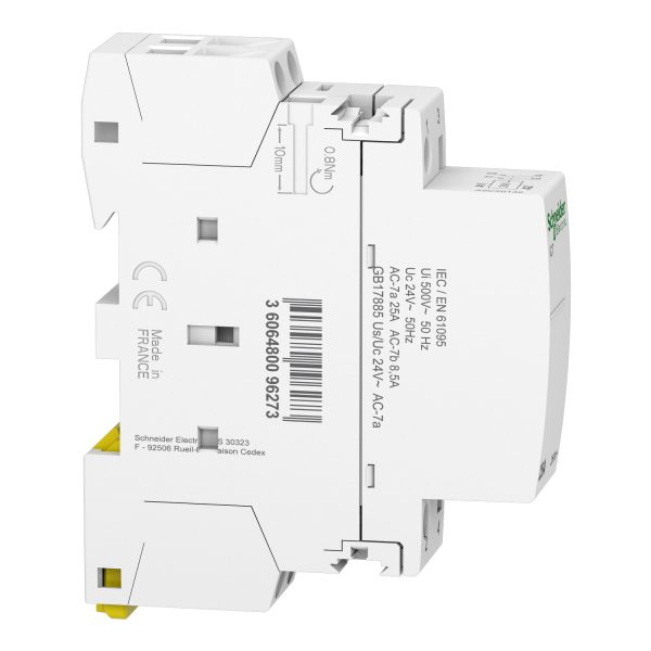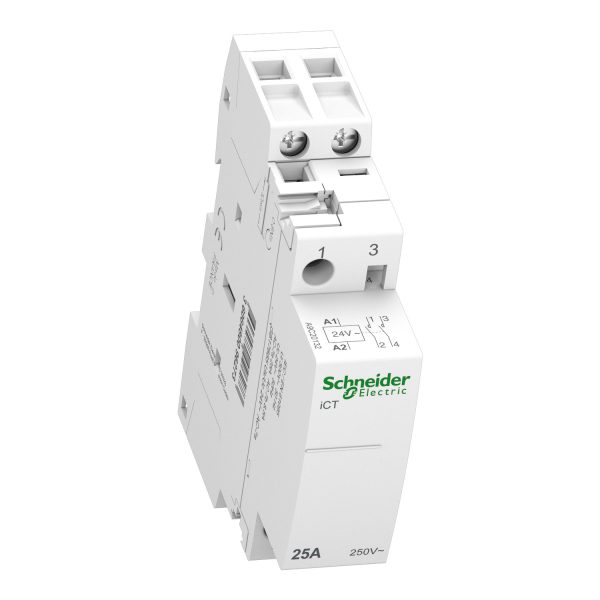 Acti9 iCT це модульний контактор. Це двохполюсний контактор з можливістю віддаленого керування з 2 нормально відкритими контактами. Номінальний струм становить 25 А для AC-7a і 8,5 А для AC-7b. Номінальна робоча напруга Ue становить 250 В змінного струму. Напруга керування Uc становить 24 В змінного струму. Контактор призначенний для організації електричних схем керування. Можливі застосування: дистанційне перемикання освітлювальних навантажень, невеликих двигунів (вентиляторів, змішувачів) або систем опалення, вентиляції та кондиціонування. Він сумісний з усіма допоміжними пристроями Acti9 для керування освітленням, опаленням і вентиляцією. Відповідає стандарту МЕК 61095. Електрична зносостійкість становить до 100 000 циклів для AC-7A або AC-1, 30 000 циклів для AC-7C, AC-7B, AC-3, AC-5A або AC-5B. Максимум 6 перемикань за хвилину. Номінальна напруга ізоляції Ui становить 500 В змінного струму. Номінальна імпульсна витримувана напруга Uimp становить 4 кВ. Ступінь забруднення пристрою 2. Призначений для встановлення на DIN-рейку. Його ширина складає 2 модулі по 9 мм. Колір виробу білий (RAL9003). Розміри: (Ш) 81 мм x (В) 18 мм x (Г) 68,5 мм. Відповідно до стандарту МЕК 60529, ступінь захисту IP20 і IP40 при встановленні в щиті. Робоча температура від -5°C до 60°C. Температура зберігання від -40°С до 70°С.