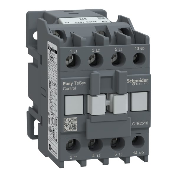 3-полюсний контактор EasyPact TVS для резистивного навантаження та управління двигунами до 25 A 11 кВт при 440 В. Він має котушку змінного струму 220 В 50 Гц, вбудовані допоміжні контакти 1НО, з’єднання живлення та керування за допомогою гвинтових затискачів. Ширина 45,5 мм для стандартної швидкості роботи до 1800 циклів на годину. Він забезпечує стандартну надійність і довговічність із електричною міцністю 1,2 М циклів AC-3 і 10 М циклами механічною довговічністю. Він має робочу температуру від -5 °C до 55 °C і монтується на DIN-рейку, працює без зниження номінальних характеристик на висоті до 3000 м. Сертифіковано за кількома стандартами (IEC, CCC, EAC) і відповідає вимогам Green Premium (RoHs/Reach).