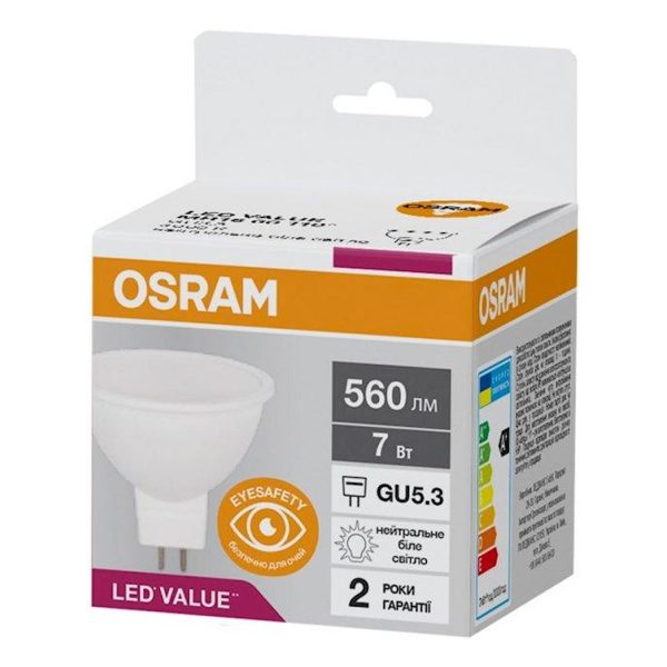 Лампа ЛЕД точкова 7W 4000K 560lm GU5.3 LED MR16 60 840 230V 10X1 UA (2 роки) OSRAM