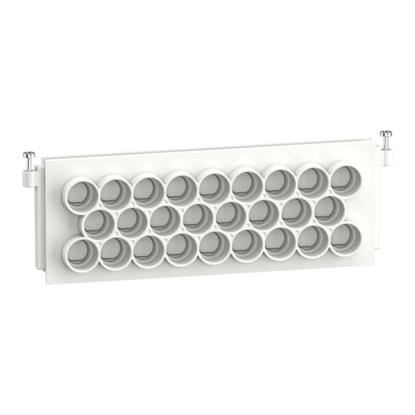 Пластина для введеня кабелю. Призначена для встановлення в щит 13 модулів навісного встановлення. Може бути встановлена у верхній або нижній частині щита. Ступінь захисту IP40. Виготовлена з пластику. Має 26 входів для кабелів. Колір білий (RAL 9003). Стійкість пластику до полумя та надмірної температури 650°C. Загальні розміри: (Ш) 240 мм x (В) 23 мм x (Г) 140 мм. Вага 400 г.