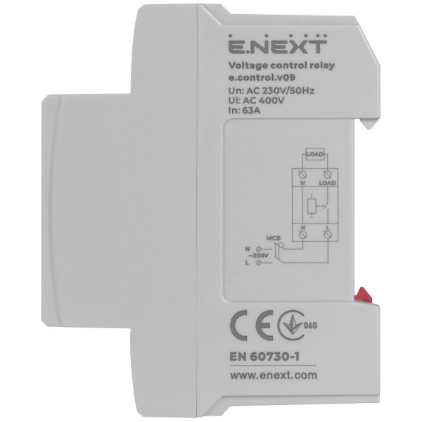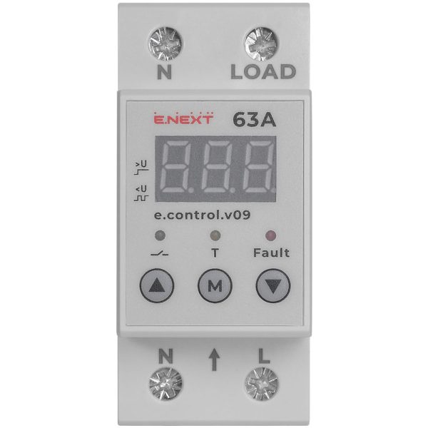 Реле контролю напруги однофазне 63А з індикацією e.control.v09 призначено для безперервного контролю величини напруги живлення в однофазних ланцюгах змінного струму та захисту споживачів електроенергії від підвищеної або зниженої напруги шляхом відключення напруги живлення при його виході за встановлені межі із заданою витримкою часу та автоматичного включення живлення із заданою витримкою часу при відновленні нормального (номінального) рівня напруги. Метод виміру напруги – реальне середньоквадратичне значення (Tru RMS).