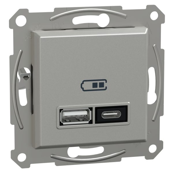 Скористайтеся рішенням для швидкого заряджання від Schneider Electric із зарядним пристроєм Asfora USB-A та USB-C PD PPS потужністю 21 Вт в алюмінієвого кольору. Цей пристрій призначений для будь-якого внутрішнього середовища та живлення від електромережі. Розетка оснащена передовою технологією заряджання USB-C Power Delivery Programmable Power Supply (PD PPS), що підвищує продуктивність заряджання акумулятора. Вона розумно вибирає найбільшу потужність, яку може витримати пристрій, і підтримує всі новітні технології заряджання акумулятора. Вона також є зворотньо сумісною. USB розетка забезпечує оптимальне швидке заряджання смартфонів і пристроїв, таких як навушники, смартфони, планшети та інші. Вона має захист OVC III, від перегріву, короткого замикання, пускового струму та перевантаження. Максимальна потужність порту USB A 18 Вт, він призначений для зарядки невеликих електронних пристроїв, а також підтримує швидке заряджання та фірмові протоколи: 5 В постійного струму 3 А 15 Вт; 9 В постійного струму 2 А 18 Вт; 12 В постійного струму 1.5 А 18 Вт. Максимальна потужність порту USB C 21 Вт, він призначений для мобільних пристроїв, а також підтримує швидку зарядку PD та фірмові протоколи: 5 В постійного струму 3 А 15 Вт; 9 В постійного струму 2.33 А 21 Вт; 12 В постійного струму 1.75 А 21 Вт; 5 В – 12 В постійного струму 0.1 А – 3 А макс 21 Вт. Разом USB-порти по типу A та C мають максимальну потужність 17 Вт і максимальний струм 2,4 А на кожен порт. Зносостійкість USB-портів більше 10 000 циклів. Споживання в режимі очікування менше 0,05 Вт, вхідна напруга 220-240 В змінного струму, частота 50-60 Гц. Термін служби становить 30 000 годин з вихідною потужністю 21 Вт при 25 °C. Призначена для врізного монтажу. Розміри: (Ш) 70.8 мм х (В) 70.8 мм х (D) 42.5 мм. Вага – 117.04 г Ступінь захисту IP20 та IK02, робоча температура – від 0°C до 40°C. Постачається в коробці з прозорим вікном та євроотвором. Має європейську декларацію відповідності (EU), звіт CB. Відповідає стандартам EN-МЕК 62368-1, МЕК 61000-3-2, EN 61558-1, EN 61558-2-16, EN 50032, EN 55035, EN 50563, EcoDesign 2019/1782/EC, RoHS і REACH.