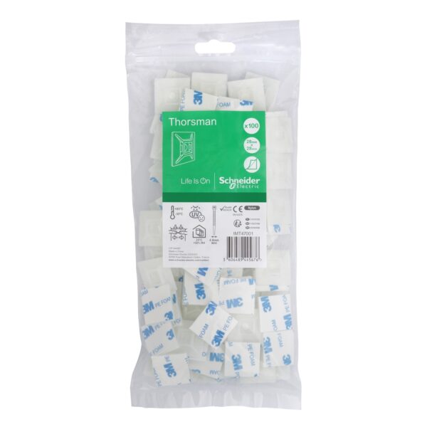 Самоклеюча основа Thorsman від Schneider Electric. Матеріал для монтажу кабельних стяжок шириною 4,8 мм. Має самоклеючу основу 3M™. Розміри виробу: (Ш) 28 мм x (В) 28 мм x (Г) 6,4 мм. Виготовлений з PA (поліаміду) 6. 6. Температура навколишнього середовища для експлуатації: від -30°C до +85°C. Упаковка виготовлена з матеріалу, що підлягає 100% вторинній переробці. Комплект зі 100 штук у пакеті, що закривається на zip застібку. Кабельні аксесуари Thorsman розроблені для досягнення максимального результату. Асортимент кабельних аксесуарів і кріплень Thorsman забезпечує широку пропозицію для всіх потреб клієнтів і охоплює максимальну кількість застосувань, гнучкість, надійність і продуктивність. Продукція відповідає стандарту МЕК 62275.