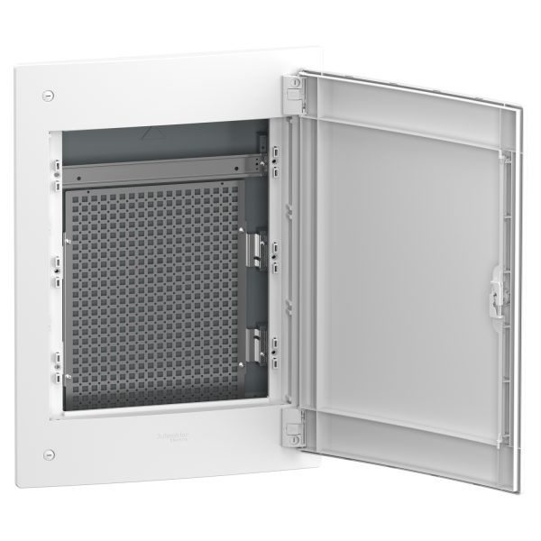 Мультимедійний щит врізний PrismaSeT XS. Зроблений з пластику, щит містить 1 ряд 18 модулів ( 18 мм ) і перфоровану решітчасту пластину. У ньому можна розмістити всі типи модульних і немодульних розподільних пристроїв. Щит призначений для встановлення всередині приміщень. Ступінь захисту IP40 ( при закритих дверях ). Комплектується суцільними дверима. Колір корпусу, пластрону і дверей білий (RAL 9003). Щит призначений для використання у житлових та промислових секторах. Щит розреблено для електриків, він ергономічний та гнучкий у встановленні. Кабелі можуть вводитися через верхню або нижню частину щита за допомогою зйомних пластин для введення кабелів. Можливо вводити кабелі та шини. Оснащений 1 задньою панеллю, 1 універсальною решіткою та 1 DIN-рейкою. Решітка сумісна з серією LexCom Home, що дозволяє легко і швидко закріпити DIN-рейку або активні елементи, такі як ADSL, а також зручно організувати прокладку кабелів. З щитом комплектуються: 1 маркувальний набір, 1 захист для етикеток, 1 заглушка та деякі елементи кріплення кабелів. Клас електричної ізоляції II. Номінальна напруга ізоляції Ui 400 В. Категорія перенапруги II. Номінальний струм In 125А. Розсіювана потужність 87 Вт. Повністю відповідає стандартам МЄК 60670-1 і 24, 61439-1 і 3. Загальні розміри: (Ш) 486 мм x (В) 660 мм x (Г) 129 мм. Вага виробу 5,680 кг. Корпус, пластрон, задня частина та двері виготовлені з технопластика. Стійкість пластику до полумя та надмірної температури 750°C для корпусу, 850°C для задньої панелі та 650°C для дверей. Ступінь ударозахисту IK09 ( при закритих дверях ).