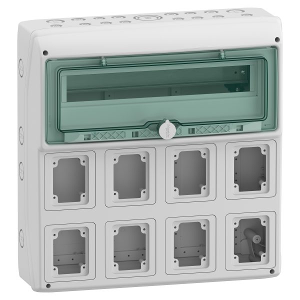 Водонепроникний навісний щит Mureva призначений для встановлення промислових розеток. Розмір щита для втановлення модульного обладнання 1 ряд з 18 модулів по 18 мм. Містить 8 отворів для промислових розеток, кнопок або світлових індикаторів. Ступінь захисту IP65. Щит призначений для внутрішнього або зовнішнього встановлення. У комплект поставки входять прозорі зелені двері для зони встановлення модульного обладнання. Колір світло-сірий (RAL 7035). Призначений для встановлення в житлових та невеликих комерційних будівлях і промисловості. Кабелі можна підводити у верхній або нижній частині щита через 17 попередньо підготовлених місць для підведення. Він оснащений задньою пластиною та передньою кришкою з виїмкою. Щит оснащений DIN-рейкою, 8 пластинами для розеток 65×85 мм і 2 пластинами для кнопкового керування. Набір для маркування постачається разом із щитом. Клас електроізоляції II (подвійна ізоляція). Категорія перенапруги II класу. Розсіювана потужність становить 39 Вт. Номінальний струм In до 90А. Цей продукт відповідає стандарту МЕК 61439-3. Розміри: (Ш) 448 мм x (В) 460 мм x (Г) 160 мм. Вага виробу 3,4 кг. Матеріал являє собою самозатухаючий полімерний матеріал. Його стійкість до полумя та надмірної температури становить 650°C згідно з МЕК 60695-2-1. Він стійкий до ультрафіолету. Ступінь ударозахисту IK09.