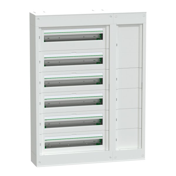 Розподільчий щит навісний PrismaSeT XS, оснащений бічними каналами. Зроблений з металу та пластику, щит містить 6 рядів по 24 модулі ( 18мм ). У ньому можна розмістити всі типи модульних розподільчих пристроїв. Щит та бічний канал мають збільшений простір у першому ряду для розміщення вхідного автоматичного вимикача або NSXm 160, оснащеного, за необхідності, пристроем диференційного захисту. Щит призначений для встановлення всередині приміщень. Ступінь захисту IP41 ( з дверима ) і IP30 ( без дверей ). Колір корпусу, пластрону білий (RAL 9003). Щит призначений для використання у житлових та промислових секторах. Щит розреблено для електриків, він ергономічний та гнучкий у встановленні. Кабелі можуть вводитися через верхню або нижню частину щита за допомогою зйомних пластин для введення кабелів. Можливо вводити кабелі, шини та кабельні короби. Щит поставляється в зібраному вигляді. Оснащений 6 DIN-рейками. Рейки зйомні, що полегшує прокладання кабелів та технічне обслуговування. Комплектується з 1 клемним блоком заземлення. Клемний блок забезпечує 72 виходи (9×25 мм² + 63×4 мм²). Щит може вмістити вертикальний розподільний блок Acti9 VDIS 24 модулі. З щитом комплектуються: 6 захисних пластин, 5 кабельних зажимів, 6 пластронів, 6 заглушок. Клас електричної ізоляції II. Номінальна напруга ізоляції Ui 400 В. Категорія перенапруги II. Номінальний струм In 160 А. Відповідає стандартам МЄК 61439-1, 2 і 3. Загальні розміри: (Ш) 820 мм x (В) 1106 мм x (Г) 191 мм. Вага виробу 27,740 кг.