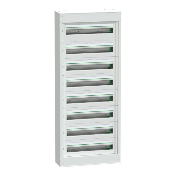 Розподільчий щит навісний PrismaSeT S. Зроблений з металу та пластику, щит містить 8 рядів по 24 модулі ( 18мм ). У щиті можна розмістити всі типи модульних розподільних пристроїв. У першому ряду щита збільшений простір для розміщення вхідного автоматичного вимикача або NSXm 160, оснащеного, за необхідності, пристроем диференційного захисту. Щит призначений для встановлення всередині приміщень. Ступінь захисту IP41 ( з дверима ) і IP30 ( без дверей ). Колір корпусу, пластрону білий (RAL 9003). Щит призначений для використання у житлових та промислових секторах. Щит розреблено для електриків, він ергономічний та гнучкий у встановленні. Кабелі можуть вводитися через верхню або нижню частину щита за допомогою зйомних пластин для введення кабелів. Можливо вводити кабелі, шини та кабельні короби. Щит поставляється в зібраному вигляді. Оснащений 8 DIN-рейками. Рейки зйомні, що полегшує прокладання кабелів та технічне обслуговування. Комплектується з 1 клемним блоком заземлення. Клемний блок забезпечує 96 виходів (12×25 мм² + 84×4 мм²). Щит може вмістити вертикальний розподільний блок Acti9 VDIS 24 модулі. З щитом комплектуються: 8 захисних пластин, 6 кабельних зажимів, 8 пластронів, 8 заглушок. Клас електричної ізоляції II. Номінальна напруга ізоляції Ui 400 В. Категорія перенапруги II. Номінальний струм In 160 А. Відповідає стандартам МЄК 61439-1, 2 і 3. Загальні розміри: (Ш) 570 мм x (В) 1406 мм x (Г) 191 мм. Вага виробу 25,760 кг.
