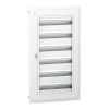 Розподільчий щит врізний PrismaSeT XS. Зроблений з металу та пластику, щит містить 6 рядів по 24 модулі ( 18мм ). У щиті можна розмістити всі типи модульних розподільних пристроїв. Щит призначений для встановлення всередині приміщень. Ступінь захисту IP40 ( при закритих дверях ). Комплектується прозорими дверима. Колір корпусу, пластрону білий (RAL 9003). Щит призначений для використання у житлових та промислових секторах. Щит розреблено для електриків, він ергономічний та гнучкий у встановленні. Кабелі можуть вводитися через верхню або нижню частину щита за допомогою зйомних пластин для введення кабелів. Можливо вводити кабелі та шини. Оснащений 1 задньою панеллю та 6 DIN-рейками. Рейки зйомні, що полегшує прокладання кабелів та технічне обслуговування. Комплектується з 1 клемним блоком заземлення та 1 клемним блоком нейтралі. Клемний блок заземлення забезпечує 72 виходи (9×25 мм² + 63×4 мм²). Клемний блок нейтралі має 84 виходи (6x (3×25 мм² + 11×4мм²)). Щит може вмістити вертикальний розподільний блок Acti9 VDIS 24 модулі. З щитом комплектуються: 6 маркувальних наборів, 6 захисних пластин, 2 заглушки та елементи кріплення кабелів. Клас електричної ізоляції II. Номінальна напруга ізоляції Ui 400 В. Категорія перенапруги II. Номінальний струм In 125А. Розсіювана потужність 156 Вт. Повністю відповідає стандартам МЄК 60670-1 і 24, 61439-1 і 3. Загальні розміри: (Ш) 648 мм x (В) 1110 мм x (Г) 129 мм.