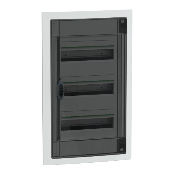 Розподільчий щит врізний PrismaSeT XS. Зроблений з пластику, щит містить 3 ряди по 13 модулів ( 18мм ). У щиті можна розмістити всі типи модульних розподільних пристроїв. Щит призначений для встановлення всередині приміщень. Ступінь захисту IP40 ( при закритих дверях ). Комплектується прозорими димчастими дверцятами. Колір корпусу, пластрону білий (RAL 9003). Щит призначений для використання у житлових та промислових секторах. Щит розреблено для електриків, він ергономічний та гнучкий у встановленні. Кабелі можуть вводитися через верхню або нижню частину щита за допомогою зйомних пластин для введення кабелів. Можливо вводити кабелі та шини. Оснащений 1 задньою панеллю та 3 DIN-рейками. Рейки зйомні, що полегшує прокладання кабелів та технічне обслуговування. Комплектується з 1 клемним блоком заземлення та 1 клемним блоком нейтралі. Клемний блок заземлення забезпечує 22 виходи (11×16 мм² + 11×10 мм²). Клемний блок нейтралі має 24 виходи (3x (4×16мм² + 4×10мм²)). З щитом комплектуються: 3 маркувальні набори, 3 захисні пластини, 1 заглушка та елементи кріплення кабелів. Клас електричної ізоляції II. Номінальна напруга ізоляції Ui 400 В. Категорія перенапруги II. Номінальний струм In 90А. Розсіювана потужність 56 Вт. Повністю відповідає стандартам МЄК 60670-1 і 24, 61439-1 і 3. Загальні розміри: (Ш) 351 мм x (В) 660 мм x (Г) 129 мм. Вага виробу 4,870 кг.
