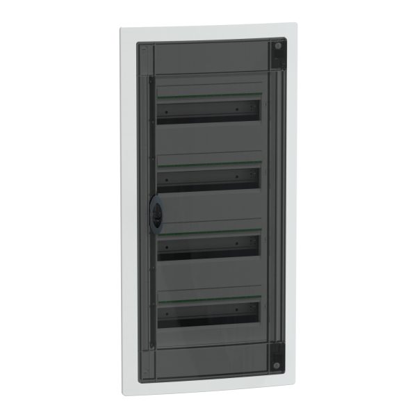 Розподільчий щит врізний PrismaSeT XS. Зроблений з пластику, щит містить 4 ряди по 13 модулів ( 18мм ). У щиті можна розмістити всі типи модульних розподільних пристроїв. Щит призначений для встановлення всередині приміщень. Ступінь захисту IP40 ( при закритих дверях ). Комплектується прозорими димчастими дверцятами. Колір корпусу, пластрону білий (RAL 9003). Щит призначений для використання у житлових та промислових секторах. Щит розреблено для електриків, він ергономічний та гнучкий у встановленні. Кабелі можуть вводитися через верхню або нижню частину щита за допомогою зйомних пластин для введення кабелів. Можливо вводити кабелі та шини. Оснащений 1 задньою панеллю та 4 DIN-рейками. Рейки зйомні, що полегшує прокладання кабелів та технічне обслуговування. Комплектується з 1 клемним блоком заземлення та 1 клемним блоком нейтралі. Клемний блок заземлення забезпечує 32 виходи (4x (4×16 мм² + 4×10 мм²)). Клемний блок нейтралі має 32 виходи (4x (4×16мм² + 4×10мм²)). З щитом комплектуються: 4 маркувальні набори, 4 захисні пластини, 1 заглушка та елементи кріплення кабелів. Клас електричної ізоляції II. Номінальна напруга ізоляції Ui 400 В. Категорія перенапруги II. Номінальний струм In 90А. Розсіювана потужність 76 Вт. Повністю відповідає стандартам МЄК 60670-1 і 24, 61439-1 і 3. Загальні розміри: (Ш) 351 мм x (В) 810 мм x (Г) 129 мм. Вага виробу 5,900 кг.