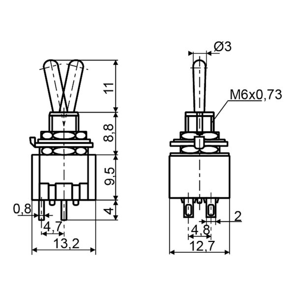 Тумблер мініатюрний MTS-201 (2 пол. – 4 кон.) Вкл-Викл
