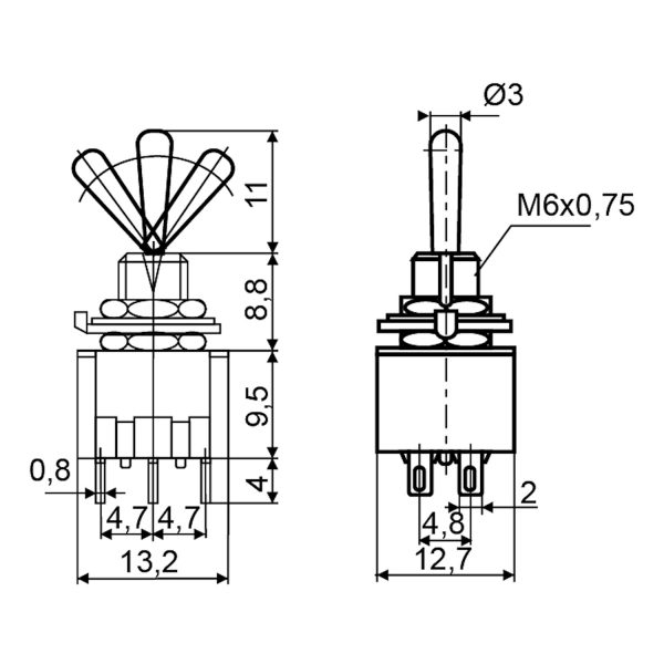 Тумблер мініатюрний MTS-203 (3 пол. – 6 кон.) Вкл-Викл-Вкл