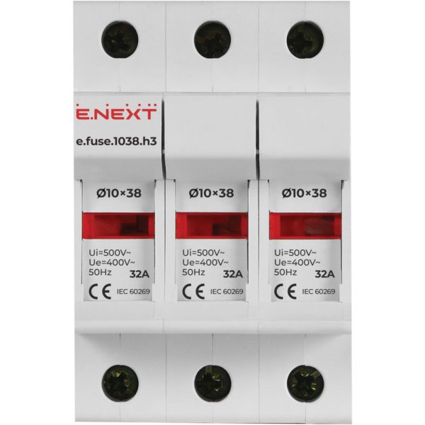 Утримувач запобіжника на Дін-рейку e.fuse.1038.h3, під запобіжник 10х38, 3р, 32А призначені для встановлення запобіжників серії e.fuse.1038 на струми від 2 до 32 А.