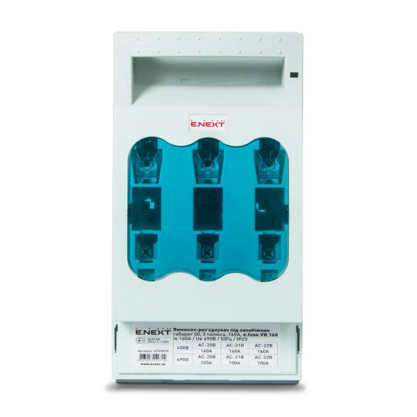 Вимикач-роз’єднувач під запобіжник e.fuse.VR.160, габарит 00, 3 полюса, 160А призначені для неавтоматичної комутації ланцюгів змінного струму номінальною напругою до 690В та номінальною частотою 50Гц. Використовуються для встановлення у низьковольтних комплектних пристроях.