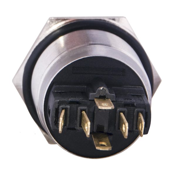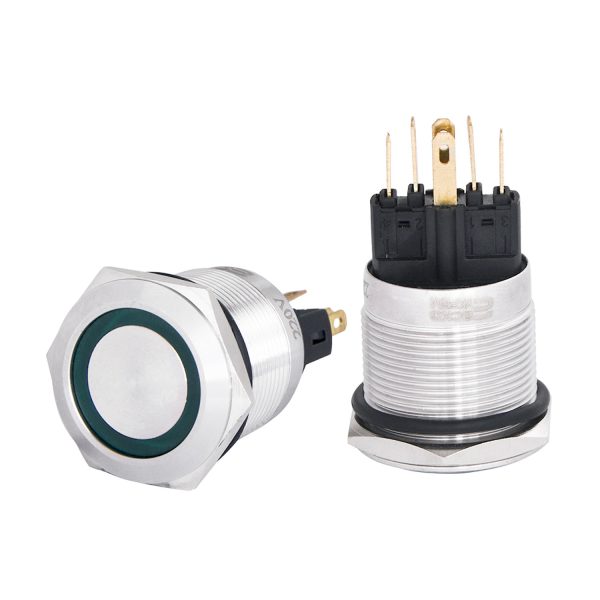 Кнопка металлическая плоская с фиксацией 1НО+1НЗ, с подсветкой, зеленая 220V. TYJ 22-371