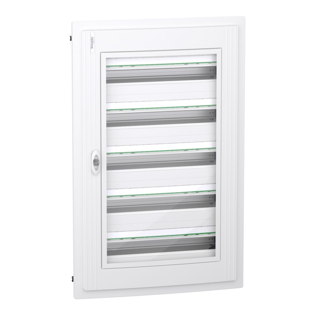 Распределительный щит навесной PrismaSeT XS. Изготовлен из пластика, щит содержит 1 ряд на 18 модулей (18мм). В щите можно разместить все типы модульных распределительных устройств. Щит предназначен для установки внутри помещений. Степень защиты IP40 (при закрытой двери). Комплектуется прозрачными дымчатыми дверцами. Цвет корпуса, пластрона белый (RAL 9003). Щит предназначен для использования в жилых и промышленных секторах. Щит разработан для электриков, он эргономичен и гибок в установке. Кабели могут вводиться через верхнюю или нижнюю часть щита с помощью съемных пластин для ввода кабелей. Возможно вводить кабели, шины и кабельные короба. Оснащен 1 задней панелью и 1 DIN-рейкой. Рейка съемная, что облегчает прокладку кабелей и техническое обслуживание. Комплектуется 1 клеммным блоком заземления и 1 клеммным блоком нейтрали. Клеммный блок заземления обеспечивает 16 выходов (8×16 мм² + 8×10 мм²). Клеммный блок нейтрали имеет 8 выходов (4×16 мм² + 4×10 мм²). С щитом комплектуются: 1 маркировочный набор, 1 защитная пластина, 1 заглушка и элементы крепления кабелей. Класс электрической изоляции II. Номинальное напряжение изоляции Ui 400 В. Категория перенапряжения II. Номинальный ток In 90А. Рассеиваемая мощность 33 Вт. Полностью соответствует стандартам МЭК 60670-1 и 24, 61439-1 и 3. Общие размеры: (Ш) 426 мм x (В) 300 мм x (Г) 145 мм. Вес изделия 2,500 кг.