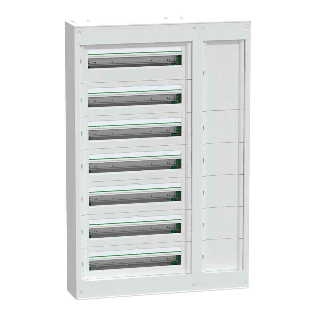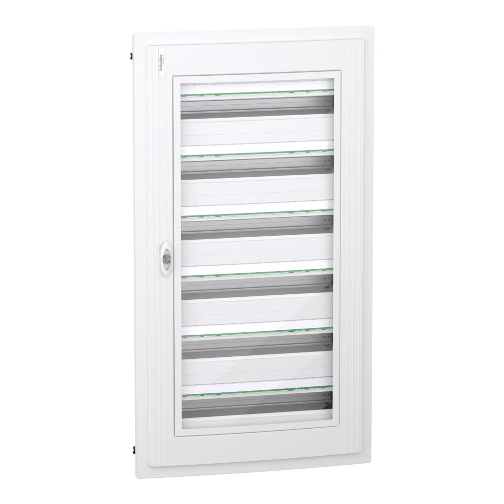 Встраиваемый распределительный щит PrismaSeT XS. Изготовлен из пластика, щит содержит 1 ряд на 18 модулей (18мм). В щите можно разместить все типы модульных распределительных устройств. Щит предназначен для установки внутри помещений. Степень защиты IP40 (при закрытой двери). Комплектуется сплошной дверью. Цвет корпуса, пластрона и двери белый (RAL 9003). Щит предназначен для использования в жилом и промышленном секторах. Щит разработан для электриков, он эргономичен и гибок в установке. Кабели могут вводиться через верхнюю или нижнюю часть щита с помощью съемных пластин для ввода кабелей. Возможно вводить кабели и шины. Оснащен 1 задней панелью и 1 DIN-рейкой. Рейка съемная, что облегчает прокладку кабелей и техническое обслуживание. Комплектуется 1 клеммным блоком заземления и 1 клеммным блоком нейтрали. Клеммный блок заземления обеспечивает 16 выходов (8×16 мм² + 8×10 мм²). Клеммный блок нейтрали имеет 8 выходов (4×16 мм² + 4×10 мм²). С щитом комплектуются: 1 маркировочный набор, 1 защитная пластина, 1 заглушка и элементы крепления кабелей. Класс электрической изоляции II. Номинальное напряжение изоляции Ui 400 В. Категория перенапряжения II. Номинальный ток In 90А. Рассеиваемая мощность 45 Вт. Полностью соответствует стандартам МЭК 60670-1 и 24, 61439-1 и 3. Общие размеры: (Ш) 486 мм x (В) 360 мм x (Г) 129 мм. Вес изделия 3,100 кг.