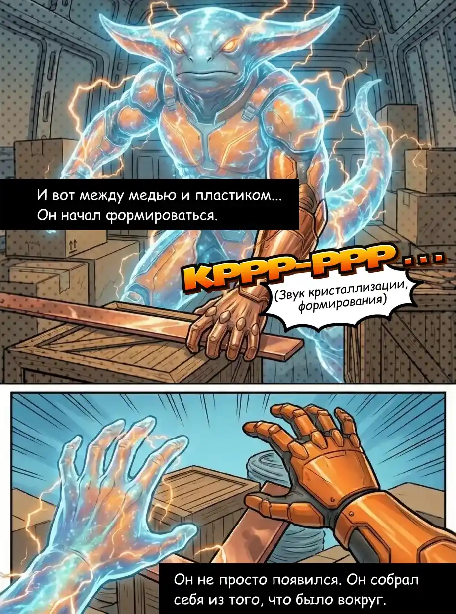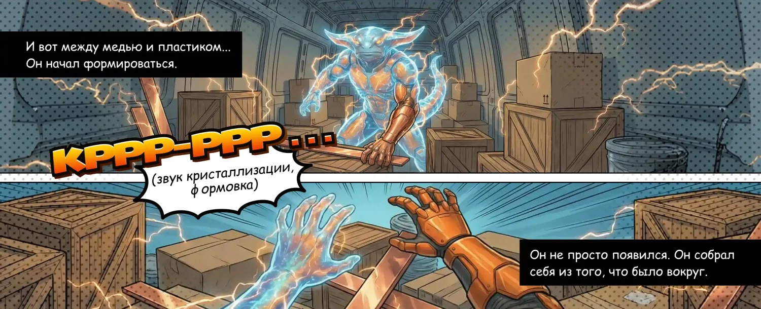 Скат вышел из буса, чувствуя собственную нестабильность. Он пульсировал, словно неуправляемый разряд, его контуры размывались в ионизированном воздухе.