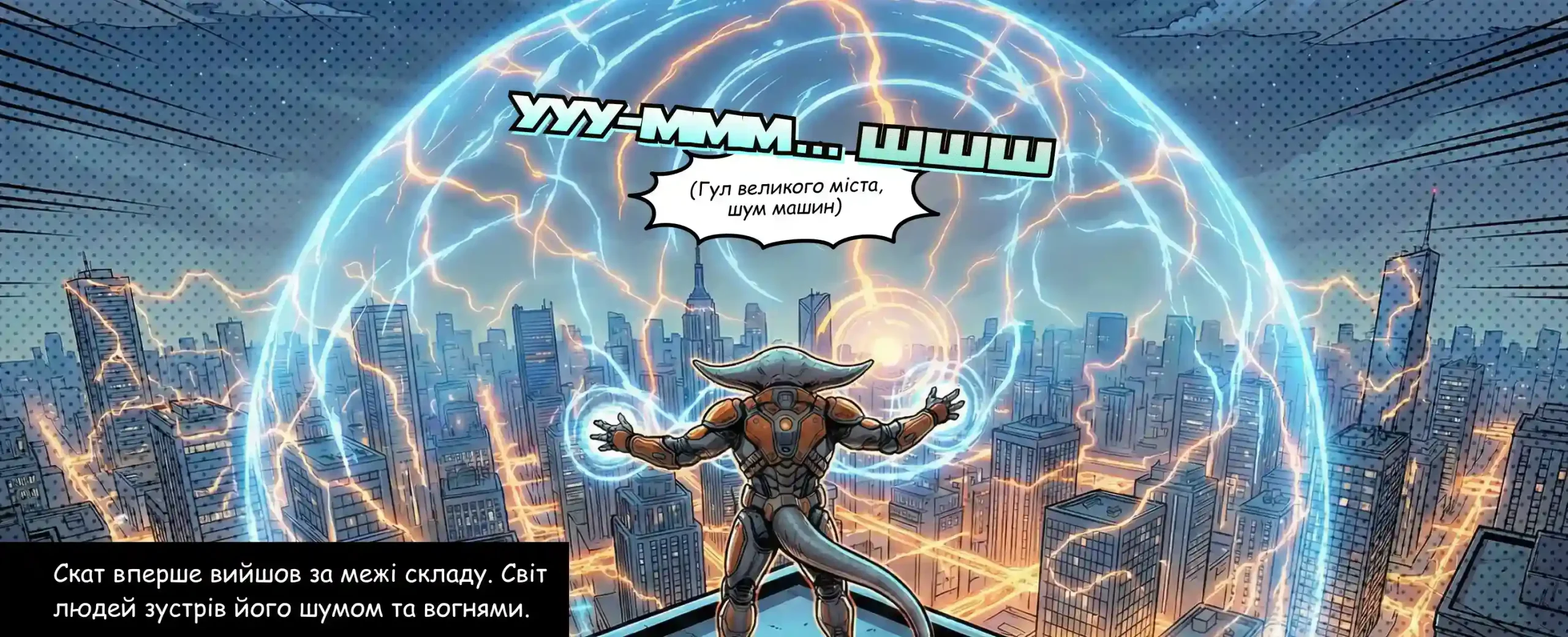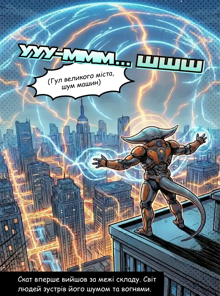 Скат вперше переступив поріг складу і вийшов у світ людей. Місто зустріло його шумом, рухом і тисячами вогнів, але він бачив його інакше.