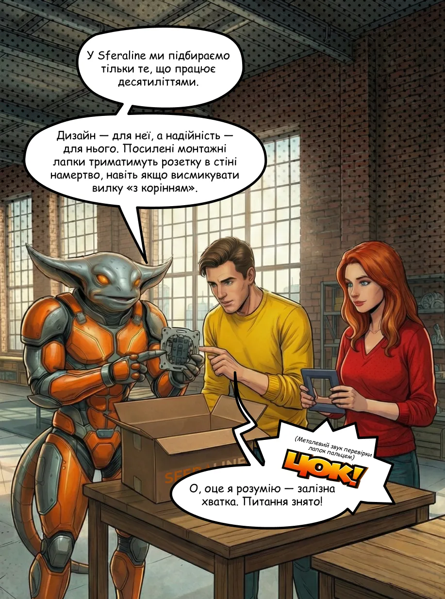— Посилені монтажні лапки забезпечують щільну фіксацію в підрозетнику. Розетка не розхитується після десятків або навіть тисяч підключень. Контактна група розрахована на стабільну роботу під навантаженням, а якість пластику зберігає форму навіть при тривалому використанні.
