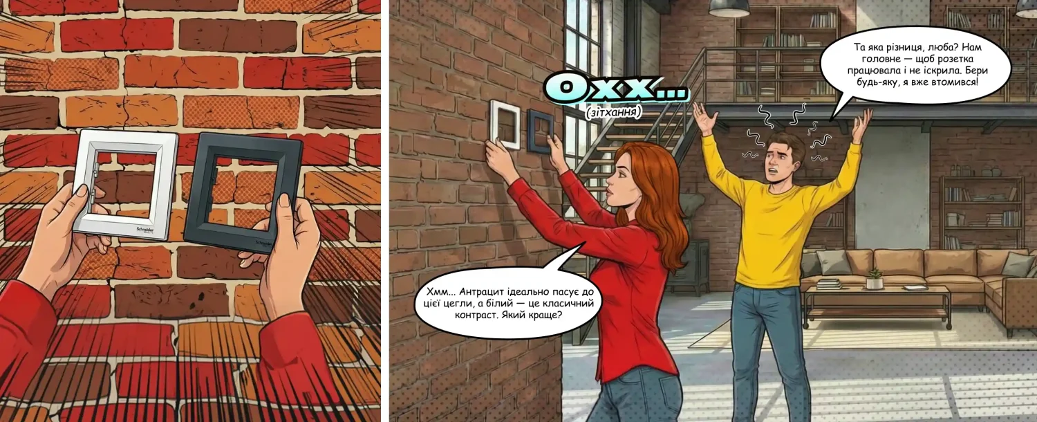 Жінка стоїть з двома рамками Schneider Asfora в руках. Прикладає одну до стіни. Потім іншу. Зітхає.