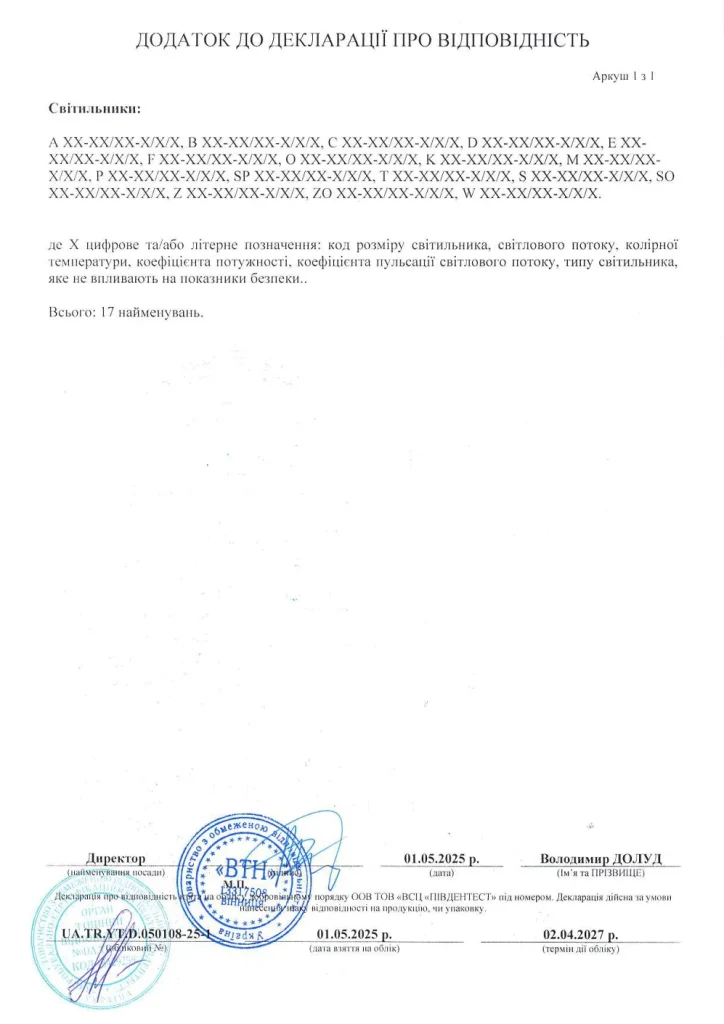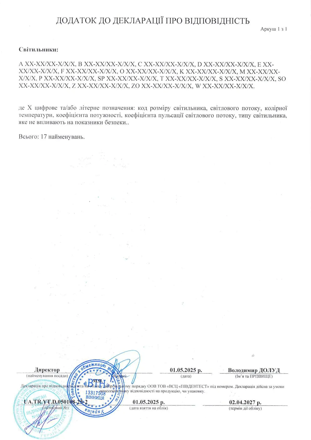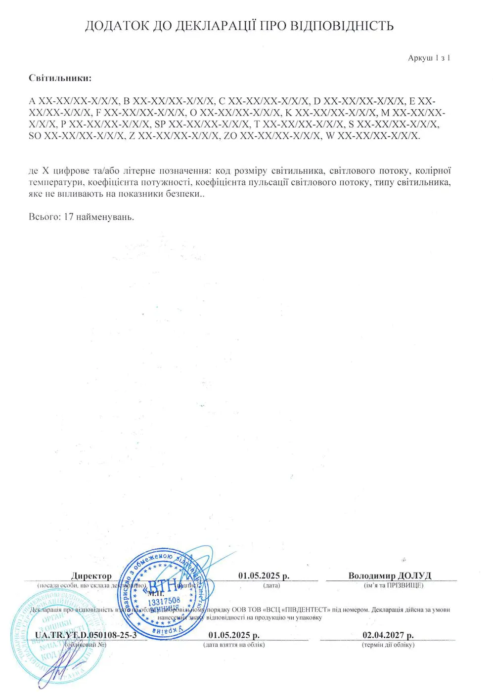 - Світлодіодні світильники різного призначення — лінійка панельних та інших LED-світильників для загального, офісного, промислового й спеціального освітлення. Використовуються у бізнес-центрах, торгових залах, конференц- і спортивних залах, аптеках, навчальних закладах, майстернях, на складах та в коридорах, забезпечуючи рівномірне, комфортне світло й сучасний вигляд інтер’єру.
