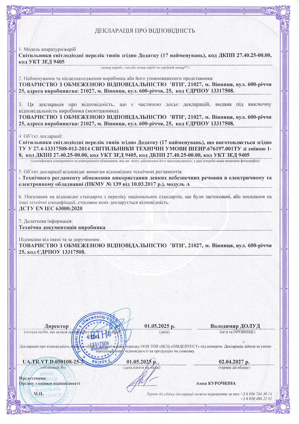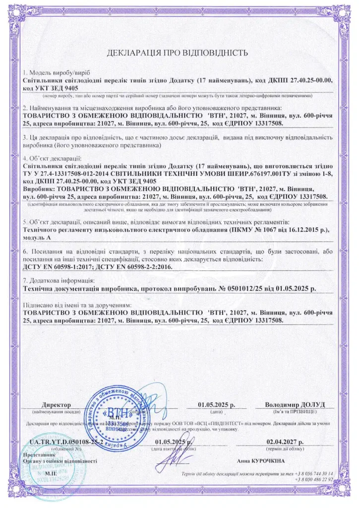- Захист навколишнього середовища — світлодіодні світильники ВТН не містять шкідливих речовин і не забруднюють довкілля, що робить їх більш екологічним вибором у порівнянні з традиційними джерелами світла.