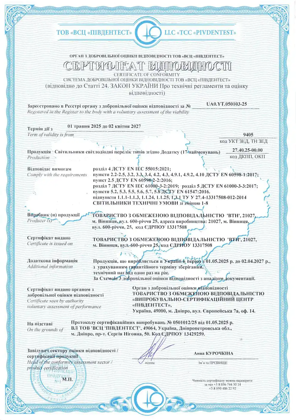 Система менеджменту якості підприємства сертифікована згідно з міжнародним стандартом ISO 9001:2015 та вимогами Європейського Союзу.Завдяки цьому ВТН послідовно підтримує високий рівень якості продукції та стабільність її характеристик у довгостроковій експлуатації.